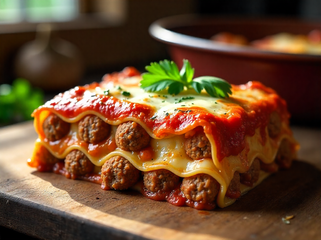 Let me break it down—this lasagna is all about balance. The meatballs were made with ground beef, pork, and a splash of Worcestershire sauce, seasoned with parsley, salt, and pepper. I formed them into small, bite-sized balls and browned them in a pan before adding them to the sauce. For the sauce, I sautéed garlic in olive oil, then added canned crushed tomatoes, a splash of red wine, and some sugar to balance the acidity. I simmered it for an hour, stirring occasionally, so it got that deep, rich flavor. The egg wash? I whisked together beaten eggs, a bit of water, and a pinch of salt, then brushed it on the lasagna noodles before baking. It gave them that slight crispness without making them too dry. Oh, and the ricotta was mixed with a little parmesan and parsley to add creaminess, while the mozzarella was sliced and layered on top for gooey, melty goodness.