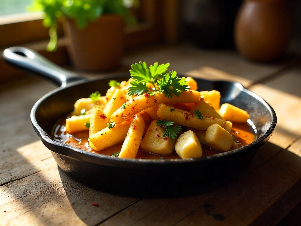 Cooking the poutine was a bit of a dance. I started by boiling the Yukon Gold potatoes until they were tender but not mushy, then peeled them and sliced them into thick, even strips. I fried them in a cast iron skillet at medium-high heat, tossing them occasionally until they turned golden and crunchy. Once the fries were done, I piled them into a big bowl, then added a generous helping of cheese curds on top. The curds were still cold when I first added them, but they melted into the fries as I stirred everything together, creating that gooey, cheesy layer that’s *so* addictive. I then poured the gravy over the top, letting it soak into the fries and curds. The key was to cook the gravy separately first, so it wasn’t too runny, and then layer it on after the fries had a chance to absorb some of that richness.