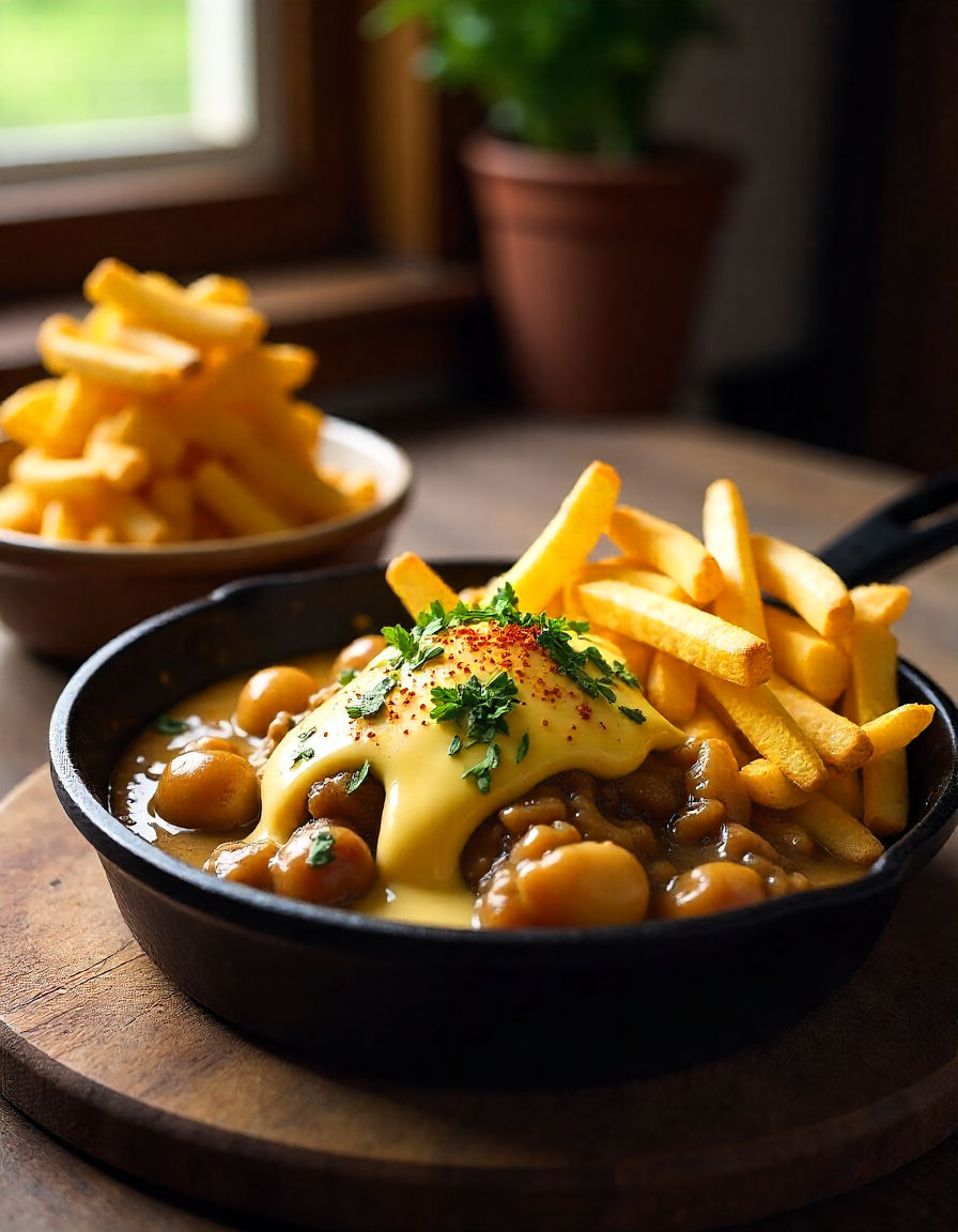 4. **Assemble:** Layer the fries in a bowl, then top with cheese curds. Pour the gravy over the fries and cheese, mixing gently to coat. Garnish with parsley and paprika before serving.